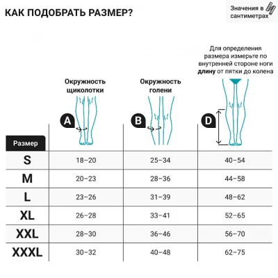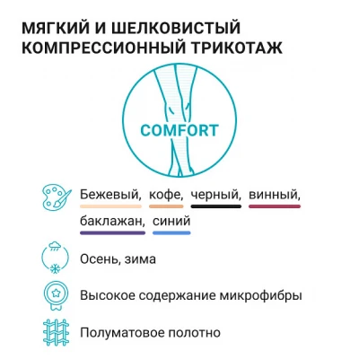Мягкий и шелковистый трикотаж для женщин, которые ценят уют и комфорт. За счет высокого содержания микрофибры (55% микроволокон нейлона) гольфы идеально подходят для холодного времени года, удобны в использовании и обладают повышенной износостойкостью. Гольфы VENOTEKS COMFORT 2С102 эффективно снимают дневные отеки при статических нагрузках (кто много сидит или стоит), уменьшают ночные судороги в ногах (венозного происхождения) и препятствуют дальнейшему прогрессированию варикозной болезни и развитию её осложнений. Рекомендованы для лечения поражения вен на уровне голени и/или стопы, в том числе у беременных женщин. Преимущества мягкие и шелковистые гольфы с микрофиброй можно носить в холодное время года под брюки, они хорошо сохраняют тепло и создают комфорт; материал «микрофибра» обеспечивает легкость надевания и придает повышенную износостойкость; вывязанная резинка надежно фиксирует изделие на ноге, не создавая перетяжек; вывязанная пятка с Y вставкой – надежная фиксация изделия на стопе. Показания отечный синдром ног; расширенные вены длиной более 5 см, множественные расширенные вены, варикозные узлы без трофических нарушений; частые ночные судороги икроножных мышц; острый тромбофлебит; профилактика рецидива венозной трофической язвы; заболевания вен во время беременности. Противопоказания Эластичная компрессия противопоказана пациентам с заболеванием периферических артерий на поздних стадиях (снижение лодыжечно-плечевого индекса ниже 0,7),при тяжелых неврологических нарушениях, лимфангиите, аллергии к компонентам компрессионного изделия. При снижении давления на лодыжке ниже 100 мм рт.ст. (но не менее 60 мм рт.ст.) могут быть использованы изделия I класса компрессии. Относительными противопоказаниями к назначению компрессии являются субкомпенсация и декомпенсация кровообращения (из-за опасности развития острой сердечной недостаточности), острый экссудативный дерматит. Имеются противопоказания. Необходимо проконсультироваться со специалистом и ознакомиться с инструкцией по применению. Уход Изделие рекомендуется стирать после каждого ношения для восстановления компрессионных свойств. Разрешена ручная стирка и машинная стирка в режиме для стирки деликатных тканей без машинного отжима при температуре не более 30°С. В качестве моющих средств нужно выбирать жидкие слабощелочные шампуни или средства для стирки деликатных тканей. Нельзя использовать стиральные порошки и кондиционеры. При машинной стирке необходимо стирать изделие в сетчатом мешочке для белья. После ручной стирки изделие нужно тщательно прополоскать в теплой воде. Отжим изделия производите вручную, завернув изделие в полотенце и слегка отжимая. Сушите изделие в расправленном виде при комнатной температуре или в прохладном месте на сухом полотенце. Силиконовые резинки-фиксаторы (если они предусмотрены в изделии) нужно беречь от попадания воды. Они будут хорошо прилипать к коже, если их протирать хлопковой тканью, смоченной 20%-м спиртовым раствором. Гарантийный срок трикотажа на сохранение компрессионных лечебных свойств - 6 месяцев со дня продажи Изделие медицинского назначения обмену и возврату не подлежит.