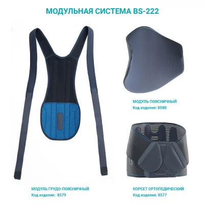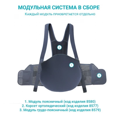Грудопоясничный модуль Orlett BSS- 222 (1) с 2 гибкими металлическими ребрами и дополнительными фиксирующими ремнями разгружает и стабилизирует грудной и поясничный отделы позвоночника. Модуль выполнен из современного эластичного материала с повышенными показателями влаго-воздухопроницаемости. Является частью модульной системы, которая позволяет осуществлять этапное лечение заболеваний позвоночника. Дополнительные элементы системы: Корсет BS-222 Standart/ High Поясничный модуль жесткий BS-222 Дополнительные модули могут использоваться вместе с корсетом BS-222 Standart / High для стабилизации и разгрузки грудопоясничного отдела позвоночника. Также модули могут использоваться в составе полного комплекта модульной системы для полной фиксации грудопоясничного отдела позвоночника. Важно! Грудопоясничный модуль не может использоваться отдельно от корсета BS-222 Standart / High! Преимущества 2 гибких металлических ребра жесткости Дополнительные ремни содержат растяжимые и нерастяжимые окантовки краев для оптимального прилегания; Современные влаго-воздухопроницаемые материалы. Возможность подобрать корсет пациенту любого роста. Надежная стабилизация и разгрузка поясничного отдела позвоночника. Возможность регулировки компрессионного воздействия и дополнительная фиксация. Дополнительные модули расширяют функциональные возможности корсета Показания Ишиас. Люмбаго. Дегенеративные заболевания грудного и поясничного отдела позвоночника. Мышечные атонии. До- и послеоперационное лечение. Грыжи межпозвонковых дисков. Спондилоартроз. Спондилолиз. Правила подбора Грудопоясничный модуль Orlett BS-222 является универсальным. Точная подгонка под размер осуществляется с помощью фиксирующих ремней. Гарантийный срок - 6 месяцев со дня продажи Изделие медицинского назначения обмену и возврату не подлежит.
