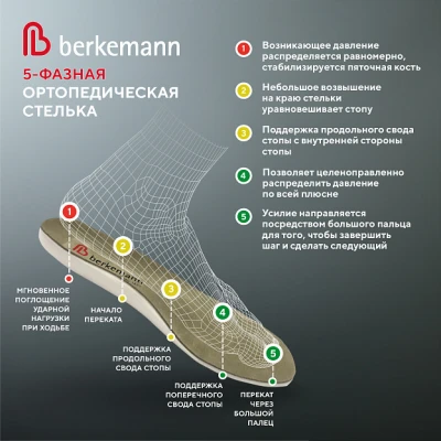 Мужские ортопедические пантолеты Berkemann Adam – комфортная классическая модель из мягкой натуральной жированной кожи в маскулинном стиле, подходящая для повседневного ношения и долгих прогулок на природе и в городе, а также людям, долгое время проводящим на ногах (продавцы, повара, медики и т.п.). Фиксация и регулировка по подъему и полноте осуществляется за счет двух кожаных ремешков на пряжке, которые обеспечивают полное раскрытие и легкость надевания и снятия. Несъемные ортопедические пятифазные стельки с поддержкой сводов с покрытием из натуральной кожи обеспечивают максимальное удобство при длительном нахождении на ногах. Модель оснащена широкой подошвой из облегченного полиуретана. Показания В комплексной терапии при маловыраженных и умеренных деформациях стопы: продольном плоскостопии, поперечном плоскостопии, комбинированном плоскостопии, вальгусной и плосковальгусной деформации стопы, высокий свод и полая стопа, отеках различной этиологии, плантарном фасциите (пяточная шпора). Преимущества Чашеобразное углубление стельки в области пятки для стабилизации заднего отдела стопы; Комфорт, равновесие и устойчивость при ходьбе; Уменьшение болевых ощущений при ходьбе, компенсация ударной нагрузки на суставы ног и позвоночник; Снижение утомляемости ног; Способствуют улучшению общего самочувствия и настроения. Пятифазная стелька Оригинальная пятифазная стелька, состоящая из пяти последовательных зон от пятки к мысу: Поглотитель ударной нагрузки на пятку: давление, возникающее при ходьбе, равномерно распределяется и стабилизирует пяточную кость; Начало переката стопы: небольшой подъем по краю стельки помогает удерживать стопу в равновесии; Поддержка продольного свода стопы: предотвращает «заваливание» стопы. Стопа направлена к внешней стороне; Поддержка поперечного свода стопы: способствует распределению давления на всю стопу; Перекат на большой палец: с помощью большого пальца ноги усилие при ходьбе направляется на следующий шаг, что облегчает завершение шага и поддерживает его. Состав Материал верха – натуральная кожа Материал подкладки – без подкладки Материал подошвы – полиуретан Материал стельки – натуральная замша Рекомендации по уходу Чистить обувь не менее раза в неделю; Грязную обувь сначала следует очистить специальной щеткой, влажной тряпкой или губкой, не давая грязи впитаться; Для чистки обуви используйте средства в соответствии с материалом обуви; Обувь сушить при комнатной температуре, предварительно набив ее бумагой, или используя специальные распорки. Не сушите обувь около огня, на батарее, на солнце, при помощи нагревательных приборов. Не оставляйте на хранение обувь в грязном мокром состоянии, т.к. это может стать причиной изменения цвета, а также привести к деформации. Избегайте воздействия на материал верха обуви щелочей, кислот и других активных растворителей. Страна производитель Германия Подробнее о бренде Гарантийный срок – 30 дней со дня покупки.