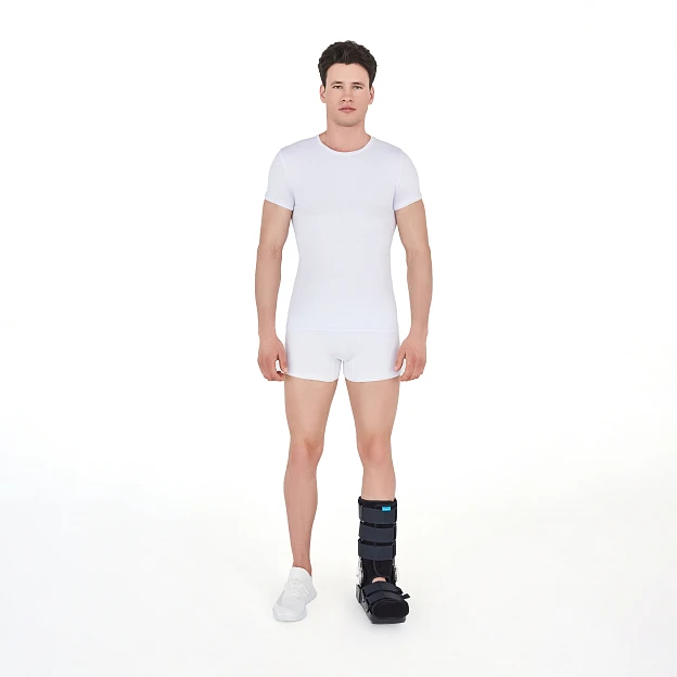 Ортез при необходимости позволяет полностью иммобилизовать (зафиксировать) голеностопный сустав или увеличить объём сгибания-разгибания шагом в 10 градусов при сохранении боковой стабилизации. Его конструкция позволяет иммобилизовать сустав в положении подошвенного сгибания и тыльного сгибания (при повреждении ахиллова сухожилия). Перекат подошвы ортеза обеспечивает возможность физиологической походки, а подушки-подпяточники снижают ударные нагрузки на голеностоп и амортизируют при ходьбе. Ортез способствует разгрузке пяточной кости, что в сочетании с широкой подошвой, позволяющей надевать его поверх послеоперационных повязок, способствует ранней мобилизации и ускорению выздоровления. Преимущества: состоит из металлических шин с шарнирами, оснащёнными регуляторами объёма движений, сапожка-манжеты на голень и стопы и подошвы с перекатом; манжета фиксируется на голени и стопе с помощью удобных застёжек «Велкро»; шины с шарнирами крепятся к манжетам с помощью застёжек «Велкро» и дополнительно фиксируются ремнями, снабжёнными «Велкро»; ремни позволяют регулировать степень прилегания ортеза к коже и его давление на мышцы; специальная подошва с перекатом обеспечивает практически нормальную походку. Показания: ранняя функциональная терапия при повреждениях связок голеностопного сустава, травмах лодыжек, внутрисуставных переломах и после реконструктивных операций на голеностопном суставе; повреждения ахиллова сухожилия; параличи и парезы стопы; послеоперационная и консервативная терапия переломов малоберцовой кости, предплюсны и плюсны; реабилитация после переломов костей стопы и нижней трети голени. Состав: 20% полиамид; 18% полиуретан; 14% полиэстер; 7% полиуретан; 2% хлопок; 25% алюминий; 8% сталь; 6% полиэтилен. Гарантийный срок - 6 месяцев со дня продажи Изделие медицинского назначения обмену и возврату не подлежит.