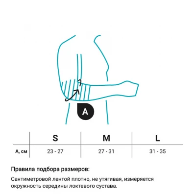 Преимущества: Анатомичная форма для точного прилегания. Сочетание различных типов вязки для максимальной терапевтической эффективности. Распределенная компрессия для сохранения нормального кровообращения. Симметричные вставки из медицинского силикона оказывают массажный эффект и стимулируют кровообращение. Дополнительный эластичный ремень фиксирует сухожилия и способствует снижению болевых ощущений. Показания: Лечение травм локтевого сустава легкой степени. Профилактика травм при частых нагрузках на локтевой сустав. Профилактика обострений воспалительных заболеваний локтевого сустава. Профилактика болевого синдрома при лечении дегенеративных заболеваний локтевого сустава. Противопоказания индивидуальная непереносимость материалов гнойные заболевания и заболевания кожи в области применения бандажа. Уход за изделием Для поддержания функциональных свойств полотна необходим регулярный уход за изделием. Рекомендуется стирать Ваше изделие после 3-5 применений. Только ручная стирка. Машинную стирку не применять. Максимальная температура 40.С. Не применять хлорсодержащие средства. Сушить не отжимая, вдали от нагревательных приборов и прямых солнечных лучей. Степень фиксации: средняя