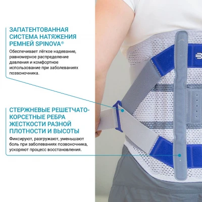 Система Spinova® Classic – инновационная модульная система производства компании Bauerfeind для быстрого восстановления при заболеваниях позвоночника. Принцип действия: Иммобилизация поясничного отдела позвоночника с функцией мобилизации и съемной оболочкой. Комбинация конструктивно связанных в систему ребер жесткости поясничного корсета и классической системы натяжения ремней способствует оптимальной стабилизации, разгрузки и уменьшению болевого синдрома. Дополнительно корсет имеет запатентованную двухкомпонентную каркасную систему Spinova® и абдоминальная панель с съёмным пелотом. Модульная система Spinova® Immo Plus Classic позволяет контролировать процесс этапной реабилитации в соответствии с индивидуальным двигательным режимом пациента. ПРЕИМУЩЕСТВА Запатентованный эластичный материал Spinova® тянется в двух направлениях, оказывая массажное действие, обеспечивая мышечную стабилизацию, быстрое восстановление. Запатентованный материал сетчатой структуры Spinova® анатомической формы для оптимальной посадки и отличного комфорта при ношении. Интегрированные ребра жесткости разной плотности и высоты фиксируют, разгружают и уменьшают боль при заболеваниях позвоночника, обеспечивают быстрое восстановление. Петлеобразный ремешок в виде буквы Y - обеспечивает легкое надевание и равномерное распределение давления. Ремешки можно корректировать до нужной длины благодаря съемным застежкам Velcro. Запатентованная система натяжения Spinova® - оказывает необходимое терапевтическое давление на живот и спину для выпрямления, стабилизации и коррекции позвоночника. Запатентованная двухкомпонентная каркасная система Spinova® - обе половины корпуса можно перемещать относительно друг друга, что обеспечивает индивидуальную адаптацию к телу. Запатентованная двойная застежка Velcro - для индивидуальной адаптации под любые особенности фигуры. Запатентованная абдоминальная панель с анатомической кромкой - совместно со съёмным абдоминальным пелотом обеспечивает стабилизацию позвоночника, что обеспечивает медицинскую эффективность. ПОКАЗАНИЯ Стабильные переломы поясничных позвонков с повреждением тел позвонков; Протрузии, грыжи межпозвонковых дисков с сильным болевым синдромом; Стеноз позвоночного канала с явлениями пареза (нехирургический, послеоперационный); Опухоли (метастазы); Спондилолиз / спондилолистез II – III степени; Фасеточный синдром; Спондилит; Фораминальный стеноз. Чтобы проверить правильность выбора размера, рекомендуется примерить корсет. Важно, чтобы корсет был удобен. Уход за изделием: Ручная стирка при 30 градусах, использование среднещелочных моющих средств, не гладить, не отбеливать. Не допускается барабанная сушка, сушка с использованием нагревательных приборов и под прямым воздействием солнечных лучей. Ленту Велкро рекомендуется застегнуть перед стиркой. Гарантийный срок - 6 месяцев со дня продажи Изделие медицинского назначения обмену и возврату не подлежит.