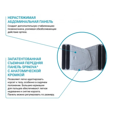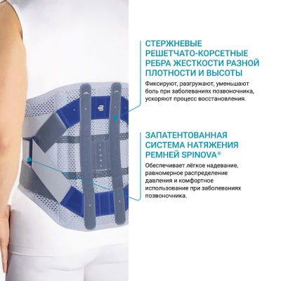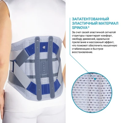 Поясничный ортез BAUERFEIND Spinova Stabi Classic для умеренной стабилизации поясничного отдела позвоночника. Система Spinova Classic - инновационная модульная система производства компании Bauerfeind для быстрого восстановления при заболеваниях позвоночника. Принцип действия ортеза для поясницы: Комбинация конструктивно связанных в систему рёбер жёсткости корсета и классической системы натяжения ремней способствует оптимальной стабилизации, разгрузке и уменьшению болевого синдрома. Благодаря абдоминальной панели снижается нагрузка на поясничный отдел позвоночника. Преимущества поясничного ортеза: запатентованный эластичный материал Spinova® тянется в двух направлениях, оказывая массажное действие, обеспечивая мышечную стабилизацию, быстрое восстановление; запатентованный материал сетчатой структуры Spinova® анатомической формы для оптимальной посадки и отличного комфорта при ношении; интегрированные рёбра жёсткости разной плотности и высоты фиксируют, разгружают и уменьшают боль при заболеваниях позвоночника, обеспечивают быстрое восстановление; петлеобразный ремешок в виде буквы Y обеспечивает лёгкое надевание и равномерное распределение давления; ремешки можно корректировать до нужной длины благодаря съёмным застёжкам Velcro; запатентованная система натяжения Spinova® оказывает необходимое терапевтическое давление на живот и спину для выпрямления, стабилизации и коррекции позвоночника; запатентованная абдоминальная панель Spinova®Classic с анатомической кромкой позволяет ортезу адаптироваться к контурам тела, особенно в сидячем положении; большие кармашки для пальцев обеспечивают лёгкое надевание и снятие изделия; запатентованная двойная застёжка Velcro для индивидуальной адаптации под любые особенности фигуры. Показания: умеренный (псевдо) корешковый синдром поясничного отдела; умеренная люмбоишиалгия в случае протрузий/грыж межпозвонковых дисков; состояния, связанные с грыжеобразованием (безоперационное/послеоперационное); состояния после дискэктомии (удаление диска); спондилолистез I степени; стеноз позвоночного канала без явлений пареза; остеохондроз 1-2ст.; остеопороз 1-2 ст. Подбор размера: Для подбора размера корсета сантиметровой лентой плотно, но не утягивая, измеряется окружность бёдер. Согласно полученным результатам подобрать корсет по таблице подбора размеров. Чтобы проверить правильность выбора размера, рекомендуется примерить корсет. Важно, чтобы корсет был удобен. Уход за изделием: Ручная стирка при 30 градусах, использование среднещелочных моющих средств, не гладить, не отбеливать. Не допускается барабанная сушка, сушка с использованием нагревательных приборов и под прямым воздействием солнечных лучей. Ленту Велкро рекомендуется застегнуть перед стиркой. Гарантийный срок - 6 месяцев со дня продажи Изделие медицинского назначения обмену и возврату не подлежит.