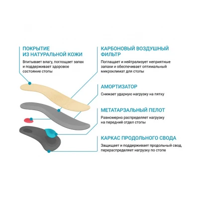 Ортопедические стельки Ortmann SolaPro Viva AX предназначены для закрытой обуви с каблуком до 4 см. Назначения использования ортопедических стелек Ortmann SolaPro Viva AX: Продольное и комбинированное плоскостопие 1-2 степени; Заболевания позвоночника и суставов нижних конечностей; Хроническая венозная недостаточность и варикозное расширение вен нижних конечностей; Тяжелые физические нагрузки; Длительное пребывание на ногах; Занятия спортом; Оказываемые стельками эффекты: Перераспределяют нагрузку по всей площади стопы и поддерживают поперечный и продольный своды; Предупреждают развитие патологических состояний и уменьшают нагрузку на позвоночник и суставы ног (тазобедренные, коленные и голеностопные); Повышают устойчивость; Улучшают кровообращение стоп, предупреждают усталость и улучшают общее самочувствие. Преимущества и особенности ортопедических стелек Ortmann SolaPro Viva: Покрытие стельки из натуральной кожи – впитывает влагу, поглощает запахи и поддерживает здоровое состояние кожи стоп; Оборудованы карбоновым воздушным фильтром – эффективно поглощает запах и обеспечивает комфортный микроклимат ног; Имеют амортизатор, снижающий ударную нагрузку на пятку; Метатарзальный пелот стелек равномерно распределяет нагрузку на передний отдел стопы; Каркас продольного свода защищает и поддерживает продольный свод и перераспределяет нагрузку по всей стопе. Гарантийный срок - 30 дней со дня продажи. Изделие медицинского назначения обмену и возврату не подлежит.