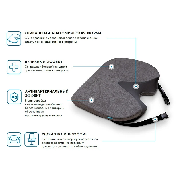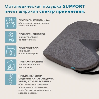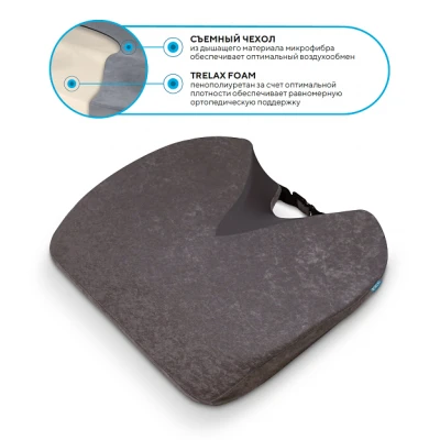 НОВИНКА! Ортопедическая подушка для сиденья - TRELAX SUPPORT с ионами серебра. Как работает ортопедическая подушка SUPPORT? Благодаря анатомической форме V-образным вырезом и оптимальной плотности основания, подушка поддерживает поясницу и снижает давление на копчик, создавая амортизацию при сидении. Уникальный дизайн позволяет безболезненно сидеть даже при смещении положения ног в боковые стороны. Особое функциональное отверстие в подушке помогает в комплексном лечении геморроя. Универсальная модель также способствует снижению нагрузки на поясничный отдел позвоночника и выравниванию осанки за счет небольшого подъема в области копчика. Конструкция подушки и система крепления позволяет использовать изделие на любых сидениях на работе, дома, в путешествии. Надежная система крепления и оптимальный размер специально разработаны для безопасного использования в автомобиле. Подушка является медицинским изделием. РУ №ФСР 2009/04606 от 14.09.2022 г. выдано Росздравнадзором, срок действия не ограничен. Оказываемые эффекты: Разгрузка ягодиц, задней поверхности бедер, седалищных бугров; Коррекция положения туловища при длительном сидении; Нормализация кровообращения в области таза и промежности при длительном сидении; Нормализация тонуса мышц пояса нижних конечностей и нижней части поясничного отдела; Повышение комфортности при длительном сидении в инвалидных креслах, сидячих каталках. Показания к применению: Комплексная реабилитация травм тазовой области; Реабилитация после заболеваний и операций в области промежности; Болевые синдромы в области крестца, крестцово-подвздошных сочленений, копчика, седалищных бугров; Дискомфорт и мышечное напряжение в области ягодиц и задней поверхности бедер при долгом нахождении в положении сидя; Профилактика пролежней в области ягодиц, седалищных бугров, задней поверхности бедер при длительном сидении в инвалидных креслах и сидячих каталках. Состав: Основа: эластичный пенополиуретан с ионами серебра. Чехол: 100% полиэстер. Способ применения: Подушку используют для сидения на обычном стуле или в автомобиле. Край подушки с выемкой должен прилегать к спинке сиденья. Для лучшего крепления подушки воспользуйтесь фиксирующим ремнем. Уход за наволочкой и чехлом: Наволочку и чехол, отдельно от подушки, можно подвергать машинной стирке при температуре не более 40°С (деликатный режим). Во избежание появления зацепок на поверхности материала рекомендуется перед стиркой вывернуть наволочку на изнаночную сторону. Не использовать отбеливатели и органические растворители. Не применять сушку в барабане. Утюжка при температуре не более 110°С. Уход за заготовкой подушки: пенополиуретан не рекомендуется стирать. Для чистки снимите чехол и проветрите заготовку. При необходимости протрите хорошо отжатой тряпкой. Гарантийный срок на подушку: 2 года со дня продажи. Гарантия на наволочку: 6 месяцев со дня продажи. Перед началом использования изделия необходимо снять с подушки наволочку и постирать ее. Изделие медицинского назначения обмену и возврату не подлежит.